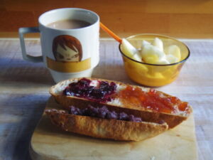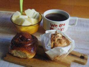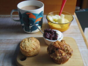 自作のチェルシーバンズ、カフェで余ったマフィン、りんごヨーグルト。