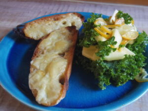 自作のカンパーニュでチーズトースト、ケールと林檎と金柑のサラダ。端っこのカンパーニュ、香ばしくて良い。