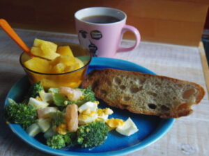 自作のカンパーニュトースト、ブロッコリーとエビと茹で卵のサラダ、パインヨーグルト。