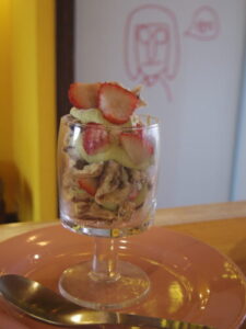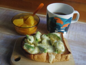 ひつじの山食でアボカドチーズトースト、パインヨーグルト。