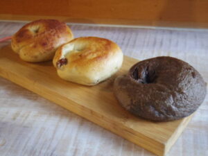 ベーグルとベイク月のチョコチップベーグル、ゴールドキウイヨーグルト。