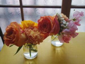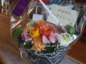 サーカスコーヒー様より10周年のお花。京都にお店をオープンしてからコーヒーはずっとサーカスコーヒーさんのものを使っています。もうお付き合いも10年。最初に訪ねて行った時は、こんなに長くお世話になるとは思ってなかったです。