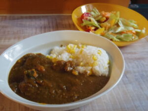 トウモロコシご飯でカレー、サラダ。冷凍してあったカレーでお助けメニュー。何も考えられないくらいヘトヘトな時に冷凍しておいたカレーがあると助かる。