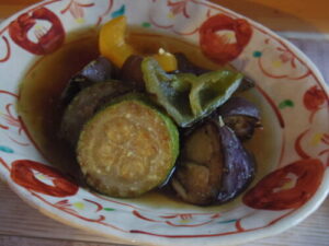 野菜の揚げ浸しは、茄子、ズッキーニ、ピーマン、黄パプリカ。漬け汁に素麺やうどん入れるだけで一食になるので、夏に重宝する作り置き。