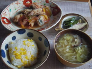 トウモロコシご飯、鯖の南蛮漬け、浅漬け、みそ汁。鯖の竜田揚げを揚げた時に仕込んでおいた南蛮漬け。