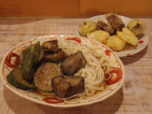 野菜の揚げ浸しで、冷やしぶっかけうどん、天ぷら。五島うどんで冷やしぶっかけ。天ぷらは、海老と椎茸。