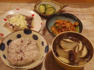 雑穀ご飯、ネギ塩レモンだれのカツオのタタキ、豚キムチ、キュウリのからし漬け、みそ汁。