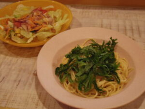 明太子スパゲティ、サラダ。明太子スパゲティには海苔より大葉トッピング派です。