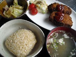 玄米ご飯、メンチカツ、ささみフライ、ピーマンと人参のキンピラ、ツナキャベツ、インスタントみそ汁。暑い時期は、お味噌汁はすぐ腐っちゃうので、インスタントにシフトしております。