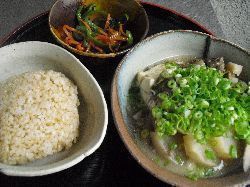 玄米ご飯、牛すじ煮込み、山芋とワカメの和え物。分葱どっさり乗せすぎて、食べた後の自分の口の葱臭さったら。