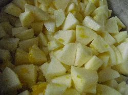 ゆずりんごチーズケーキの仕込み。大ぶりに切った紅玉にゆずの皮のすりおろし、ゆず果汁を加えて火を通す。ジャムと違うので、あんまり火を通し過ぎない感じで。一晩置いて、味をなじませる。