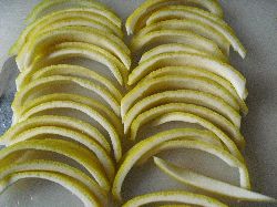 まずは、前日にレモンの皮を刻んで一晩水に漬けるところから始める。このレモンの皮を刻むのが一番大変。国産レモンって固いのです。長さを揃えて刻んでいきます。一晩水につけたら、何度か煮こぼしてエグミを抜いていきます。