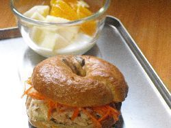 自作シナモンレーズンベーグルでツナ人参サンド、ヨーグルト&フルーツ(林檎、オレンジ)。シナモンレーズンベーグルでツナサンド、はかなり無謀かと思ったけど、美味しかった!
