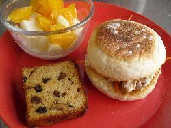自作イングリッシュマフィンでツナ人参サンド、フルーツケーキ、ヨーグルト&フルーツ(林檎、オレンジ)。ツナ缶の賞味期限が近かったので、急いで消費。あと3缶もある。しかし、久々に食べたらツナサンド、美味しい。刻んだ玉ねぎと胡椒、辛口マヨネーズ入り。