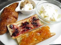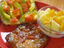 パンの耳で、アボカドトマトチーズトースト、ジャムトースト(あんず、桃バニラ)、ヨーグルト&フルーツ(オレンジ、林檎)。