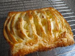 いい感じに焼き上がりましたー!食べた感じは煮林檎がシャキシャキし過ぎて、酸味が強すぎるかなー。もうちょっとトロンっとさせた方が美味しいと思う。パイ生地はすっごく美味しく出来た!あと、形はもうちょっと細長くしないとダメなので、折っていく時から最終の形を考えながら折らねば。