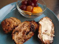 自作ライ麦パンにクリームチーズとバター。チョコの方にバター、アプリコットの方にクリームチーズ。キャラメルスコーン、柿&ぶどう。
