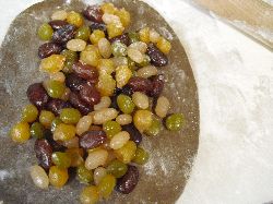 ほうじ茶入りの生地に5色のカラフルなかのこ豆。この倍量は入ってます。この豆を混ぜ込んだ食パンをバタートーストで食べるのが大好きなので、絶対バターと合うし、シュトーレンにもいいはず!と作ってみました。楽しみー。