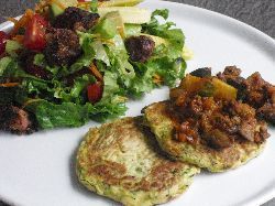 チーズ入りの方は朝ご飯に、レシピ通りのシンプルな方は、やっぱりちょっとシンプル過ぎる味だったので、冷蔵庫に残っていたドライカレー(これにもズッキーニ入ってました)をソースにして、頂きました。サラダは最近気に入ってる砂肝のローストをトッピングに。フリッターは凄くフワっとしてて、ズッキーニはクセが無いので、優しい味なのでやっぱりチーズや玉ネギが入った方がいいのかも、と。でもこれ、レシピ本ではサイドメニューとして載ってたので、お肉とかの付け合せとかのメニューならいいのかも(これメインで食べた私のスタンスがそもそも違ったか)。