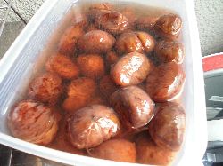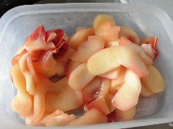 少しの砂糖と色止めのレモン果汁、皮も加えてコンポートにして、一晩置きます。一晩置くと、皮の赤い色がほんのり果肉に移って綺麗なのです。