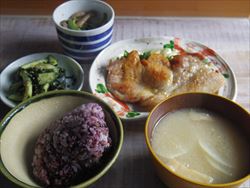 雑穀黒米ご飯、みそ漬け豚ロース、キュウリとワカメのピリ辛和え、ほうれん草とシメジのお浸し、みそ汁。味噌漬けの下には千切りキャベツが敷いてある。味噌漬けは、買ってきたやつだけど、前歯で簡単に切れるくらい柔らかい豚肉だった。また買おう。