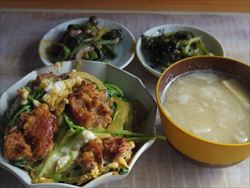 唐揚げ卵とじ丼、キュウリとワカメのピリ辛和え、ほうれん草とシメジのお浸し、みそ汁。お惣菜のから揚げと三つ葉と玉ねぎで、卵とじ丼。
