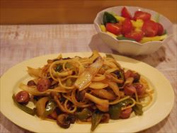ナポリタン、サラダ。ナポリタンにちょっとコチジャン入れると、美味しいと聞いてやってみたら、美味しい。
