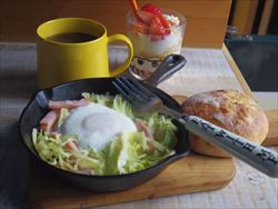 ルプチメックのじゃがいもパン、キャベツとハムの巣ごもり卵、苺メレンゲヨーグルト。