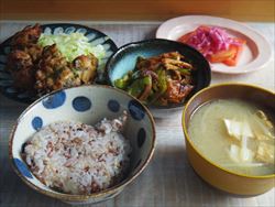 赤米ご飯、梅紫蘇から揚げにレンチンしたキャベツ、ピーマンとちくわとシメジの金平、トマトサラダ、味噌汁。下味の時に梅干しと刻んだ大葉を加えて、更にスライスした玉ねぎを衣に加えて揚げた梅紫蘇から揚げ、ちょっと目先が変わって美味しかった。