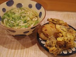 うどんと天ぷら。天ぷらは舞茸とレンコン。