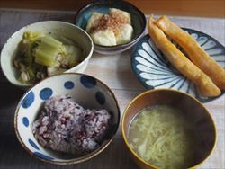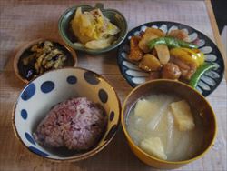 雑穀ご飯、鶏と野菜の甘酢炒め、白菜と豚肉の炊いたん(しめじ入り)、茄子のナムル、味噌汁。鶏と野菜の甘酢炒めの野菜は、黄パプリカ、紫玉ねぎ、椎茸、スナップえんどう、菊芋を使用。