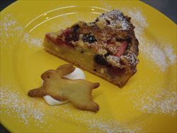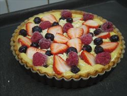 ベリーとホワイトチョコの焼きタルトは、苺、ラズベリー、ブルーベリーをアーモンドクリームと刻んだホワイトチョコの上に乗せて、クランブルを散らして焼きました。