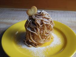 上に絞った和栗ペーストは、生クリームやバターを混ぜず、栗と渋川煮のシロップのみで作ってます。この裏ごしがめちゃくちゃ大変!栗は固いんですよねー。