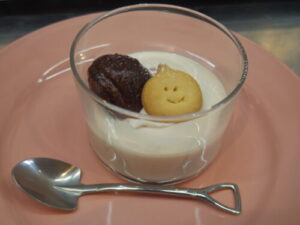 和栗のパンナコッタは、栗型のクッキーと半割の渋皮煮をゴロっと乗せて。