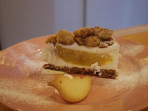 焼き芋クランブルチーズケーキは、オーダー頂いてからクランブルを乗せて仕上げます。梅田のほななで毎年出していたお菓子ですが、ここでは初めてお出しするメニューです。