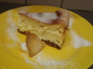 レモンアイシングチーズケーキ。ベイクドチーズケーキ生地にもたっぷりレモンの皮をすりおろして入れて、トップにレモン果汁のアイシングを施してます。