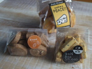 福祉施設で作られているクッキーたち。チーズクッキー、胡麻と米粉、チョコアーモンド。3種類とも違う施設のもの。美味しく頂きました。