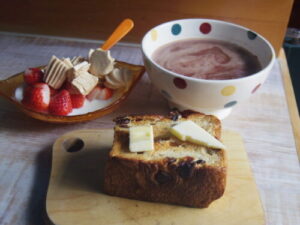 コネルヤのぶどうパンでバタートースト、苺メレンゲヨーグルト、ホットチョコレート。