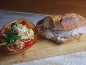 おうちぱんのバゲットで自家製ロースハムとバターのサンド、蒸しどりと香味野菜のサラダ。ジャンボンブールは一番美味しいハムの食べ方と思う。