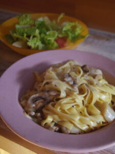 ホタテとマッシュルームのレモンクリームパスタ、サラダ。パスタはフェットチーネ。