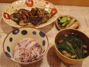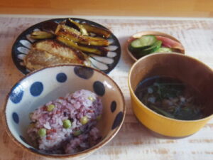 古代米豆ご飯、西京焼き、茄子の胡麻和え、三つ葉と椎茸の澄まし汁、浅漬け。