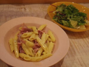 生ハムとブリーチーズのペンネ、サラダ。賞味期限ギリのブリーチーズと生ハムにちょっと牛乳で整えただけのソース、美味しかった。また絶対作ろう。