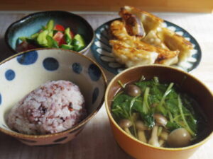 古代米ご飯、焼き餃子、キュウリとトマトのサラダ、三つ葉と椎茸の澄まし汁。