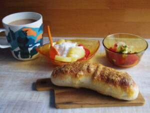 ベーグルベイクと月のハリッサチョリソーベーグル、サラダ、パイン苺ヨーグルト。