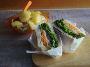 コストコのイングリッシュマフィンでサンドウィッチ、苺ゴールドキウイヨーグルト。サンドの具は、レタス、生ハム、キャロットラペ、ブリーチーズ入りオムレツ。