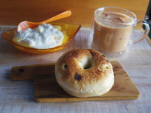 ベーグルベイクと月の、チョコチップベーグルでクリームチーズとでこぽんラムレーズンジャムサンド、キウイヨーグルト。