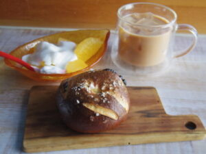 noin194のプレッツェル塩チョコベーグル、オレンジヨーグルト。