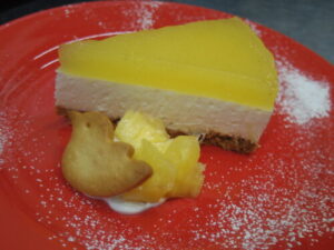 パインとココナッツミルクのレアチーズケーキ。パインのゼリー部分、無事に固まってました。カットしたパインを添えてお出ししています。