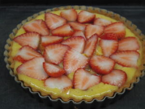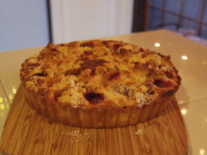 苺とキャラメルの焼きタルトは、アーモンドクリームの上にキャラメルクリームをマーブルに乗せて、生の苺をたっぷり乗せて、クランブルを散らして焼いてます。