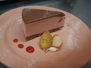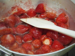 苺とチョコのレアチーズケーキは、たっぷりの苺をレアチーズケーキ生地に混ぜ込んで作りました。さっと煮た苺をミキサーにかけて、さらにちょっと煮詰めて苺のピューレを作ります。